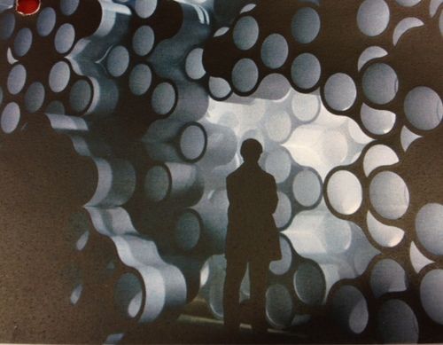 imagine a textured wall like this one (or at least elements of it) with the theate blacks behind and projectin running onto the surfaces....mmmm